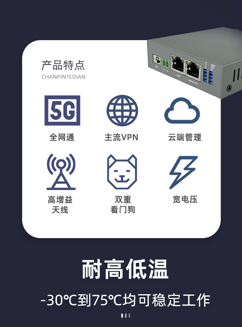 在智慧城市数字化开展的今天,智慧路灯宛如时代的引路者,社会建设也随着**智慧路灯**的普及、智慧城市的全面建设而迈入智能化、数字化、自动化的新世代。可以说智慧路灯的普及是智能化时代开启的里程碑。 智慧路灯需配备一套具备数据采集及传输功能的解决方案是实现数据可视化、数字化分析管理的必经之路,而**紧凑型DTU** IR2730可作为智慧路灯及其延伸产品(综合杆、多功能杆等)的通信及数据终端,与智慧路灯之间建立数据传输的据点,拥有数据采集、协议转换、网络连接、应急联动、设备监控等功能。并具有数据安全、性能稳定、高速传输及性价比高的特点,在智慧路灯广泛布局的建设模式中具有一定的优势。 IR2730工业路由器(紧凑型5G DTU) 的工业级设计 工业级无线模块与处理器 防护等级IP30金属外壳 5V~36V宽电压适应性强 -30℃~75℃宽温支持抗寒耐热 ESD接口防护,防静电、防浪涌、抗干扰 性能稳定适用无人值守环境 双千兆网口、双卡、双串口RS232/RS485
