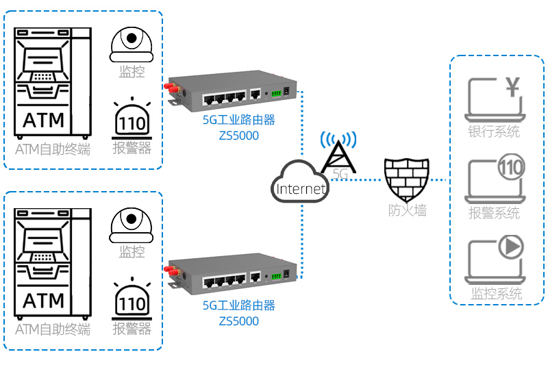 5G工业路由器应用于ATM自助终端,连接现场视频录像、报警器、ATM等,上传本地数据至银行云平台与报警系统,顺利获得APN/VPDN虚拟专网与银行服务器建立链接,进行实时数据通信,保障用户财产安全及ATM自助终端的稳定运行。