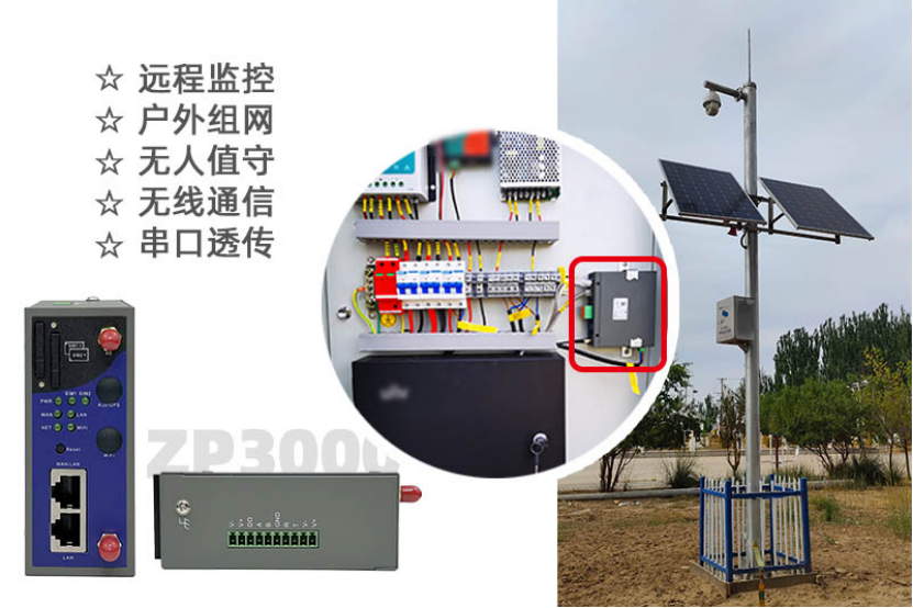 ZR3000工业路由器具备2个JS45以太网口,可进行网络连接或连接监控摄像,双串口RS485/RS232设计,连接现场传感器等设备,一个ZR3000工业4G路由器解决一个太阳能供电站点现场的所有设备连接,实现现场传感器、视频监控等远程管理。