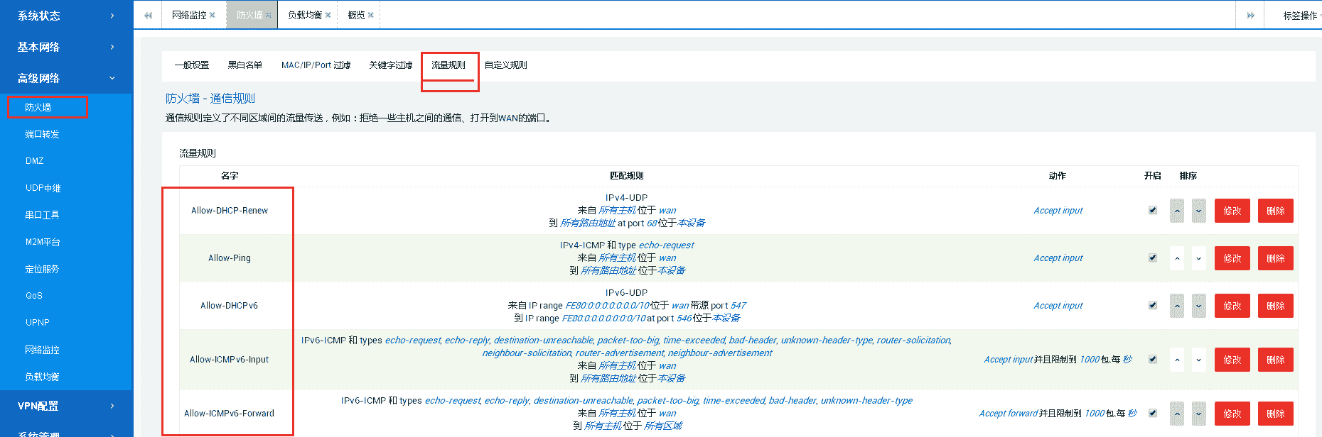 4G路由器和指定目标服务器通信基本配置 下面以只允许路由器设备和指定目标网络进行TCP+UDP协议通讯为例,即设备只能访问指定目标网络,其他网络禁止访问。具体说明配置如下: 1.设备默认配置的流量规则保持不变,新增流量规则依次自动添加到原有规则最下面,如下为默认的流量规则: 2.选择“高级网络”—“防火墙”—“新建转发规则”,自定义添加规则名称,区域修改为LAN到WAN,然后点击“添加并编辑”,