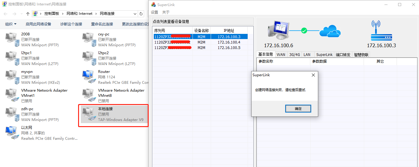 电脑端安装Superlink工具完成,或者使用过程中出现登录时提示创建网络连接失败,请检查一下问题: 1.确认电脑端是否正常创建虚拟网卡驱动(如果未正常创建,请先手动安装一下TAP网卡驱动); 2.确认TAP虚拟网卡驱动是否被不小心禁用(此时需要重新启动网卡),如下: