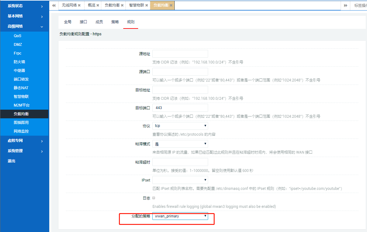 因为要使用WiFi优先,4G备份,所以设置名称为wwan_primary,同时必须关联成员wwan_m1_w1和3gwan1_m2_w1;分别如下: 4.4设置负载均衡控制规则