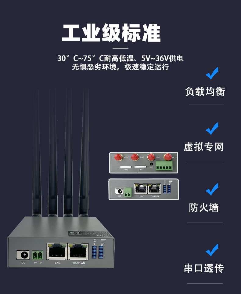 工业级设计整机硬件,不惧工业恶劣环境轻松组网 IR2730工业路由器(紧凑型5G DTU) 的兼容支持 支持全网通5G并向下兼容4G/3G,手机卡、物联网卡、APN 专网卡可用 专网通信GRE、PPTP、L2TP(L2TP over IPSec)、IPSec、OPENVPN、N2N、EOIP WAN口支持PPPoE、静态IP、DHCP客户端接入 防火墙支持黑白名单过滤,自定义通讯规则实现访问控制 软硬件双重看门狗,保障设备稳定运行不掉线 有线优先/5G备份,负载均衡 云平台远程管理,手机微信小程序管理 软硬件OEM/ODM定制化技术服务支持