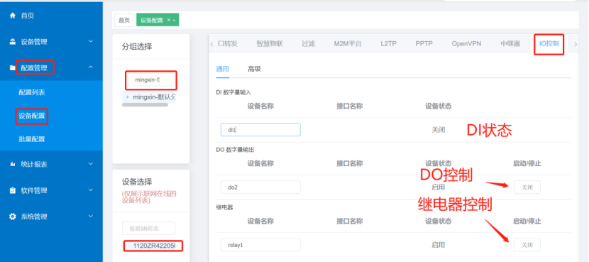 (2)登录云平台后,打开配置管理-设备配置,选择对应的分组和设备,点击IO控制即可进行相关操作,具体功能如下图: