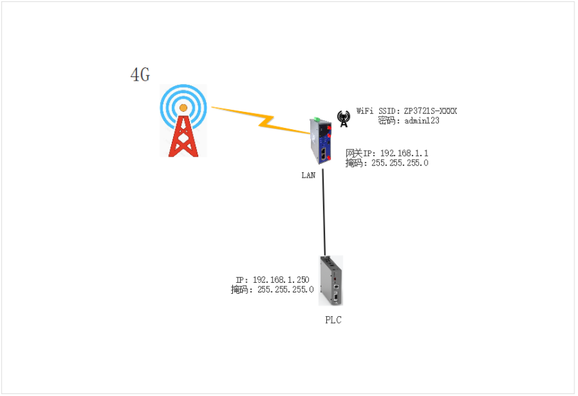 3.3 ZP网关和PLC终端连接 第一时间将ZP网关插入4G卡(或者顺利获得有线WAN及WiFi客户端模式接入互联网)及连接好网络天线后上电,然后把网关的LAN网卡和PLC的Ethernet网口连接好并上电,稍后2分钟ZP网关即可自动拨号联网成功。