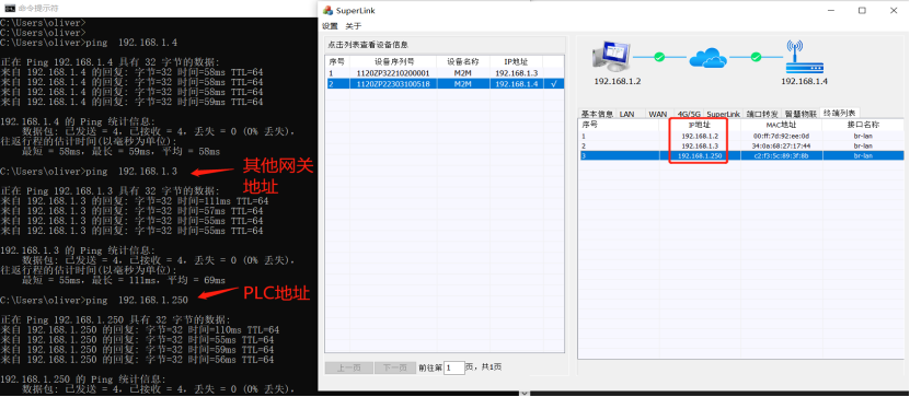 3.4云平台配置桥接模式 云平台端支持远程路由模式(默认)及网络桥接(具体以实际的版本支持为准)共2种模式。下面主要介绍桥接模式使用,分别如下。 3.4.1默认网关路由模式 Superlink网关默认为路由模式(不勾选桥接),即顺利获得Superlink工具自动子网路由表方式实现电脑侧和现场网关之间实现远程跨网段通讯。如图,路由模式下,电脑端TAP虚拟网卡和网关远程地址默认为172.16.100.X地址(由平台侧依次自动下发,无需修改),具体使用请参考另外指导文件。 3.4.2设置网关桥接模式 第一时间联系我司技术人员获取云平台登录账号。登录云平台后,找到网关对应的分组列表,点击编辑,同时勾选“桥接”,此时远程地址将默认修改为192.168.1.1(具体修改网段和用户设备所在网段保持一致即可),并点击确定。 3.5登录Superlink查看及ping用户终端测试 1)如果您之前登录过Superlink工具,此时1分钟内将收到云平台下发的重新登录提示,直接点击确定重登录(如果是首次登录Superlink则直接登录使用即可)。 2)重新登录Superlink后,会发现电脑端TAP-Windows Adapter虚拟网卡及每台ZP网关LAN地址已经桥接为和LAN接口用户终端同一局域网网段(无需修改,由平台统一自动下发),示例为192.168.1.X/24,且Superlink参数项已显示启用桥接。 3)最后,顺利获得查看终端列表选项,电脑端分别可以ping通其他网关LAN地址及用户PLC地址(192.168.1.250),如图: