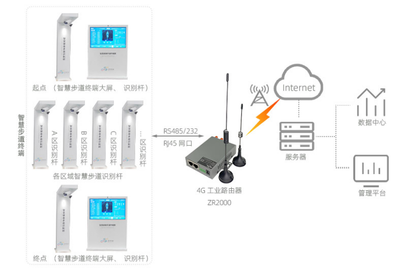 4G智慧步道由多部ZR2000工业路由器与各区域中的智慧步道系统终端完成配网连接,随后登录k8凯发管理平台,将所有工业路由器与智慧步道管理系统接入同个局域网中,实现终端和系统之间的数据互联互通,打造4G智慧步道的建设标准与远程管理。