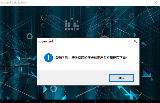 Superlink工具登录失败,不断提示请检查网络连接或账号密码信息,出现这个情况时,请分别确认如下问题: 1.第一时间确认电脑端可以正常访问互联网; 2.严格确认账号或密码信息是否完全正确(具体账号信息请查看远程网关背面标签),包括大小写信息及是否有空格出现。